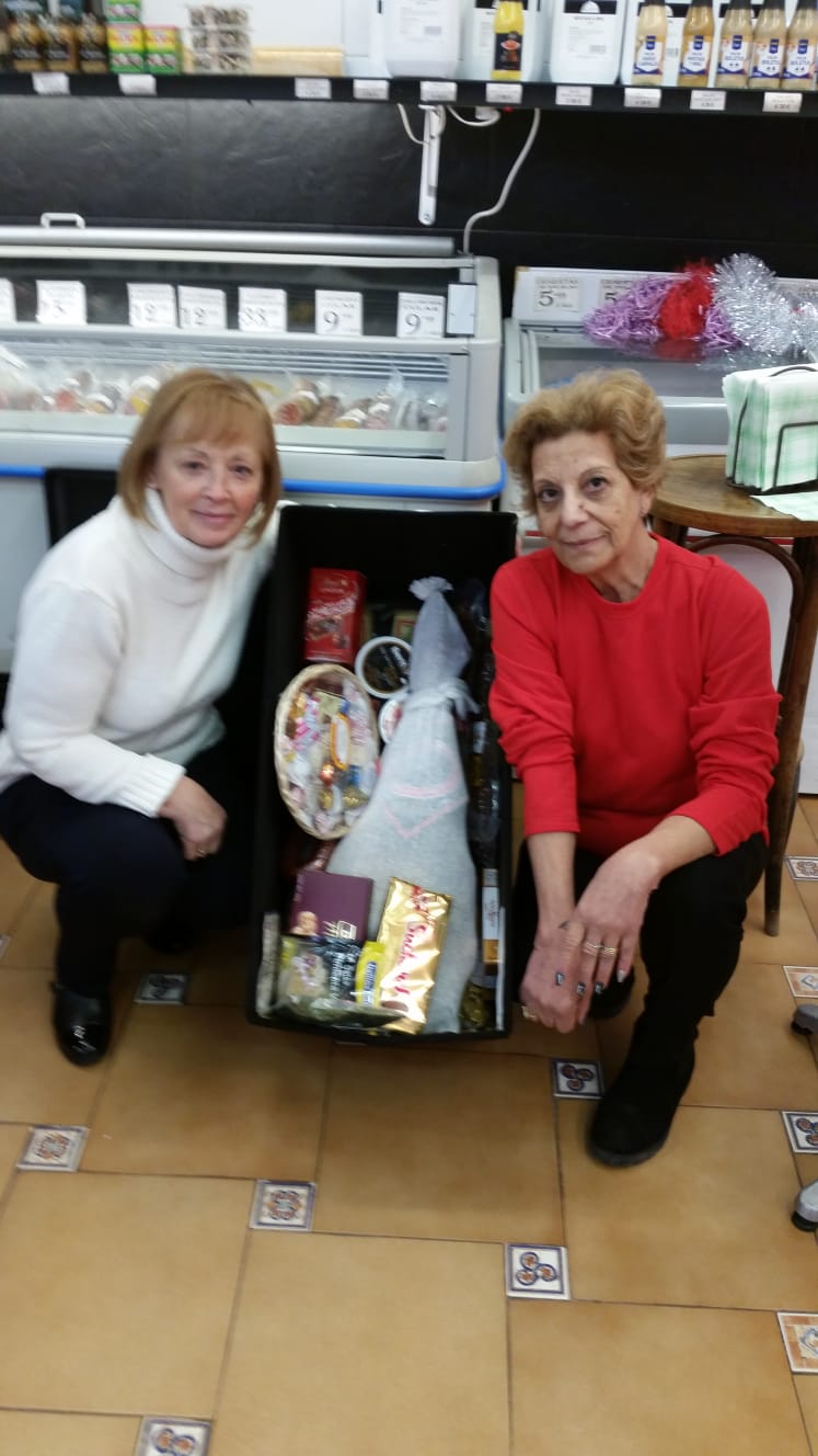Entrega de la cesta sorteada. En la foto podemos ver a Pilar Pérez que ha sido la donante de la cesta y a Mercedes Pérez que ha sido la ganadora.