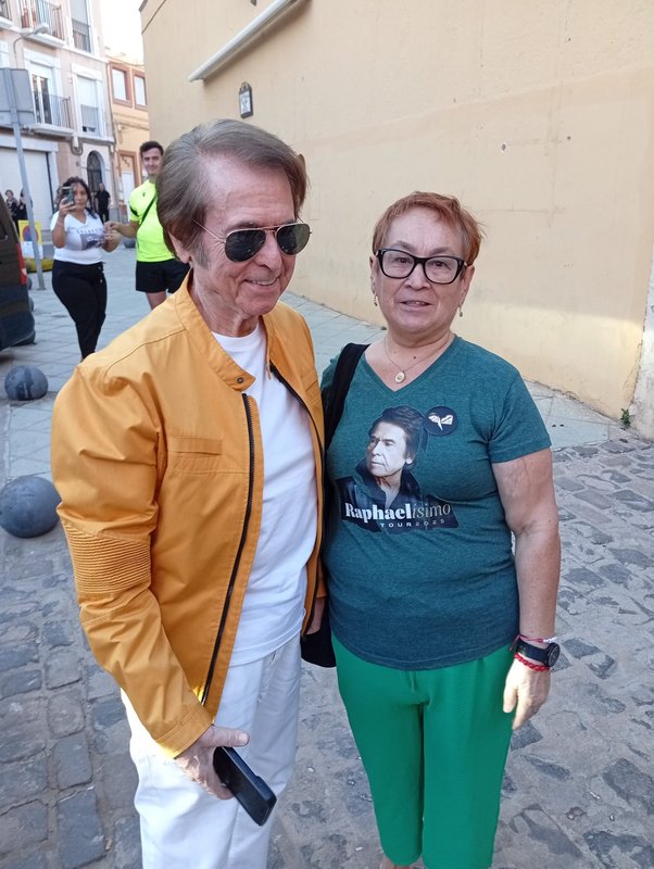 RAPHAEL LLEGANDO A LA PLAZA DE TOROS. FOTOGRAFÍA CON TOÑI (RAPHAELISTA DE ALMERÍA)